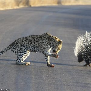 This hungry leopard had no choice but to admit defeat after picking a fight with a prickly porcupine. The predator was spotted stalking the spiky rodent in Kruger National Park…