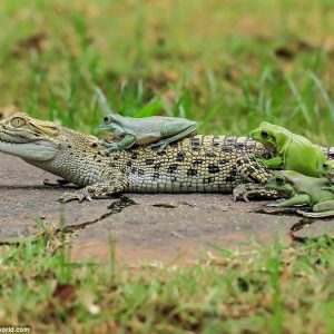 These brave frogs showed no fear when they hopped onto a caiman’s back so they could do the conga. Hilarious pictures show the moment the five tree frogs clambered up…