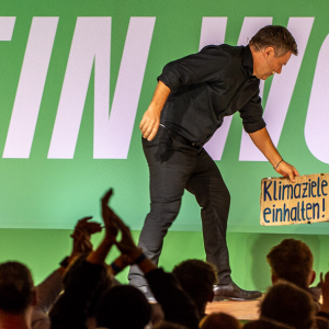 Wirtschafts- und Klimaschutzminister Robert Habeck stellt mit dem Schild eines Gastes eines seiner Ziele vor. (Foto: Thomas Hölscher) 5000 Menschen jubelten und klatschten in der Halle Münsterland, als ob es…