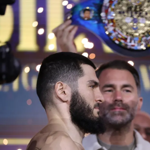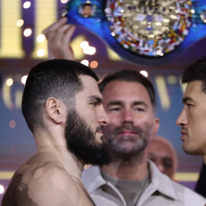RIYADH, SAUDI ARABIA – FEBRUARY 21: Artur Beterbiev and Dmitrii Bivol face off during the weigh-in … [+] ahead of their IBF, WBO, WBC and IBO World Light Heavyweight title…