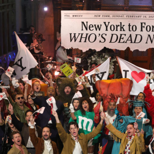 Celebrity and cast at the end of a mini musical tribute to New York. – Credit: Theo Wargo/NBC Near the end of the 50th anniversary Saturday Night Live special on…