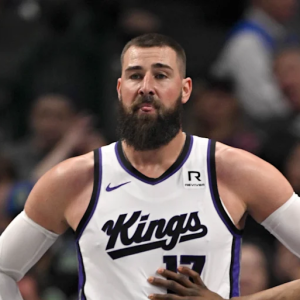 Mar 3, 2025; Dallas, Texas, USA; Sacramento Kings center Jonas Valanciunas (17) and Dallas Mavericks forward Kai Jones (23) look on during the first quarter at the American Airlines Center….
