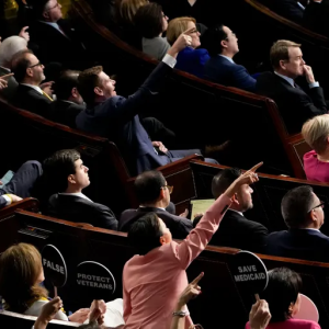 House Democrats hold up signs, point and heckle during President Trump’s address to a joint session of Congress on Tuesday. Photo: Kent Nishimura/Bloomberg via Getty Images. Congressional Democrats’ internal divisions…
