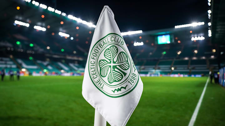Detailed shot of a corner flag with the Celtic Glasgow coat of arms, illuminated stadium in the background. / Mandatory Credit: Joeran Steinsiek