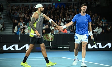 The Special Ks pulled out of their first-round doubles match on Thursday due to Kokkinakis’s pectoral injury when trailing by a set to fellow Australians James Duckworth and Aleks Vukic, but not before an hour of entertainment on John Cain Arena. The casual, party-like atmosphere was underlined by one point when Kyrgios served before an “Aussie, Aussie, Aussie” chant had time to conclude.