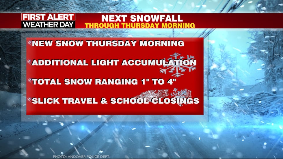The next batch of snow will arrive by pre-dawn Thursday and will last through most of the morning. This will cause an additional light snow accumulation and slick travel.