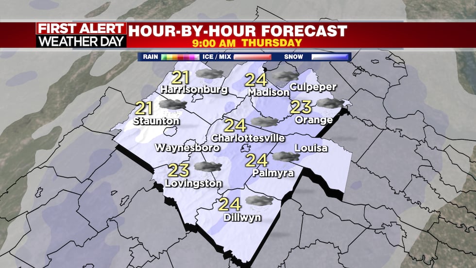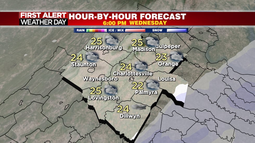 CHARLOTTESVILLE, Va. (WVIR) – Mostly light snow will continue through the mid-afternoon. A break in the steady snow by this evening and overnight. New snow will arrive Thursday morning!