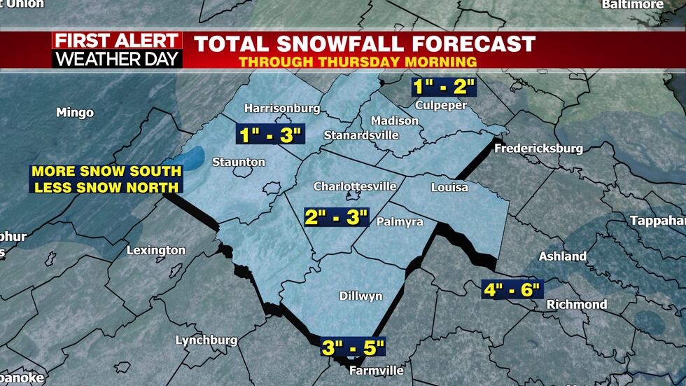 One to four inches of snow across the region by noon Thursday. Less snow north and more snow south.(WVIR 29 First Alert Weather)