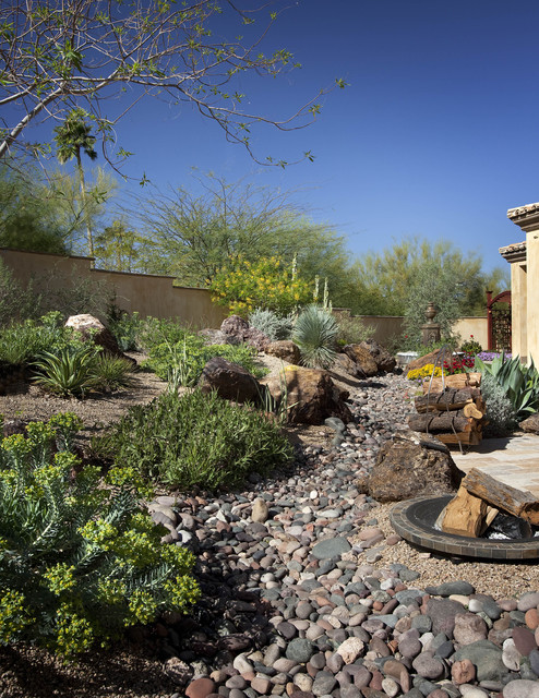 Exteriors By Chad RobertTo get the look, create a subtle grade change in your backyard with mounds of soil and low-lying areas to mimic a natural stream. Fill the “valleys” with stones and gravel, and plant the “hills” with drought-tolerant shrubs and ground covers.