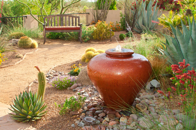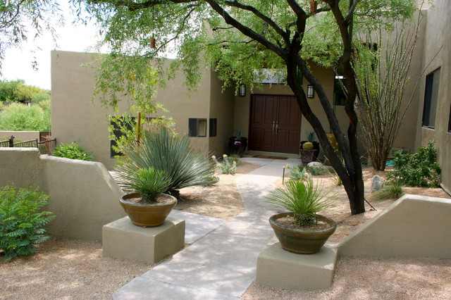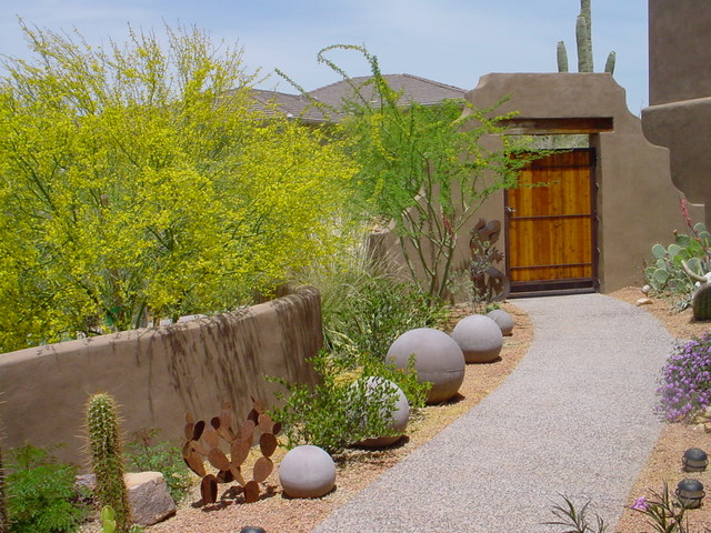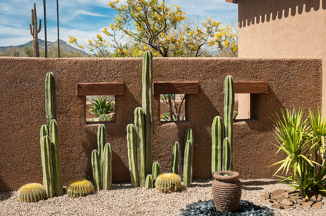 For a classic Southwest look, use traditional building materials like gravel pathways and walls made of adobe-mud or dry-stacked stone. Many contemporary landscapes combine traditional elements with more modern materials such as Cor-Ten steel and poured concrete for a striking hardscape design.