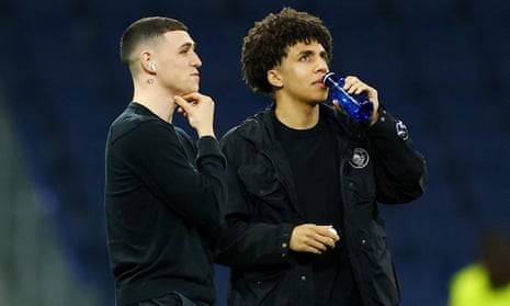 Phil Foden (left) and Rico Lewis take in the stadium. Photograph: Matthew Childs/Action Images/Reuters