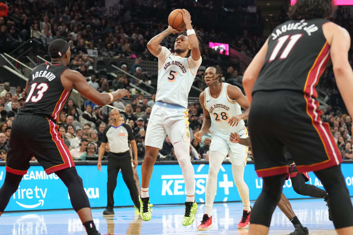 Feb 1, 2025; San Antonio, Texas, USA; San Antonio Spurs guard Stephon Castle (5) shoots over Miami Heat center Bam Adebayo (13) during the first half at Frost Bank Center.
