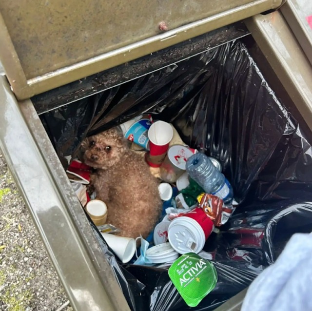 En un paseo reciente por el Parque Pacific Spirit de Vancouver, los amantes de los animales Terry Sparrow y Krista Brisk encontraron algo que les entristeció. Mientras tiraba su chicle, Sparrow notó una figura moviéndose dentro del cubo de basura. Al principio, supuso que era una ardilla o un mapache. Pero luego, Sparrow miró más de cerca y se dio cuenta de la verdad: había un perro marrón y peludo enterrado bajo la basura.